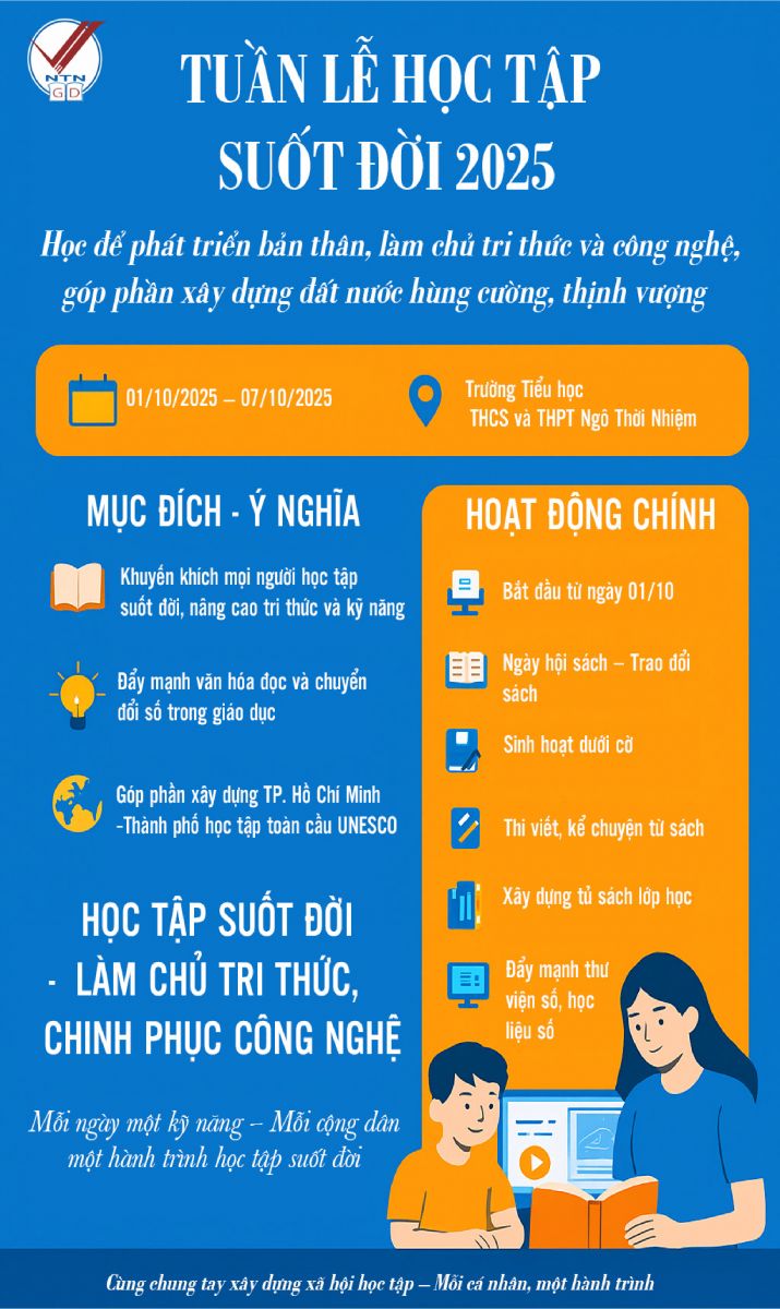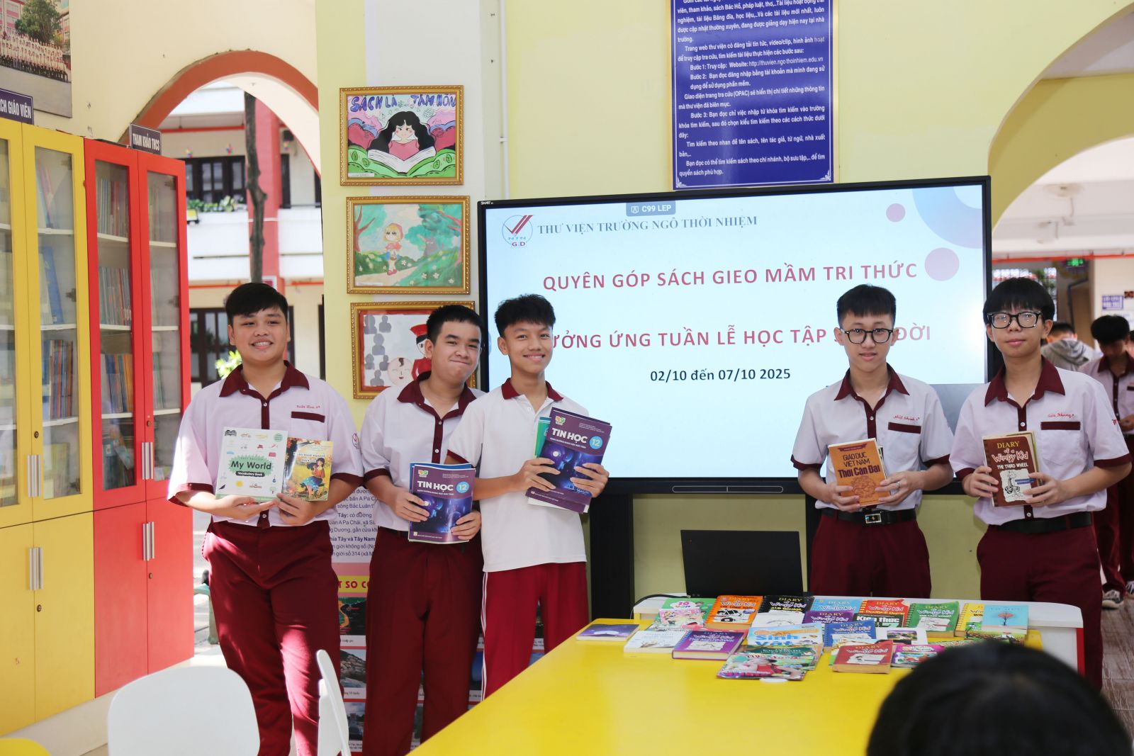 Hưởng ứng Tuần lễ học tập suốt đời năm 2025, sáng ngày 03/10 trường TH, THCS và THPT Ngô Thời Nhiệm (Phước Long) phối hợp với công ty CP Phát hành sách TP.HCM (Fahasa) đã tổ chức Ngày hội Sách với nhiều hoạt động sôi nổi, ý nghĩa nhằm khơi gợi niềm say mê đọc sách, rèn luyện thói quen học tập suốt đời cho học sinh, giáo viên và toàn thể cán bộ, nhân viên nhà trường.