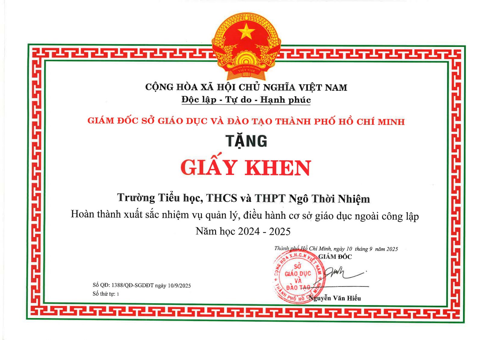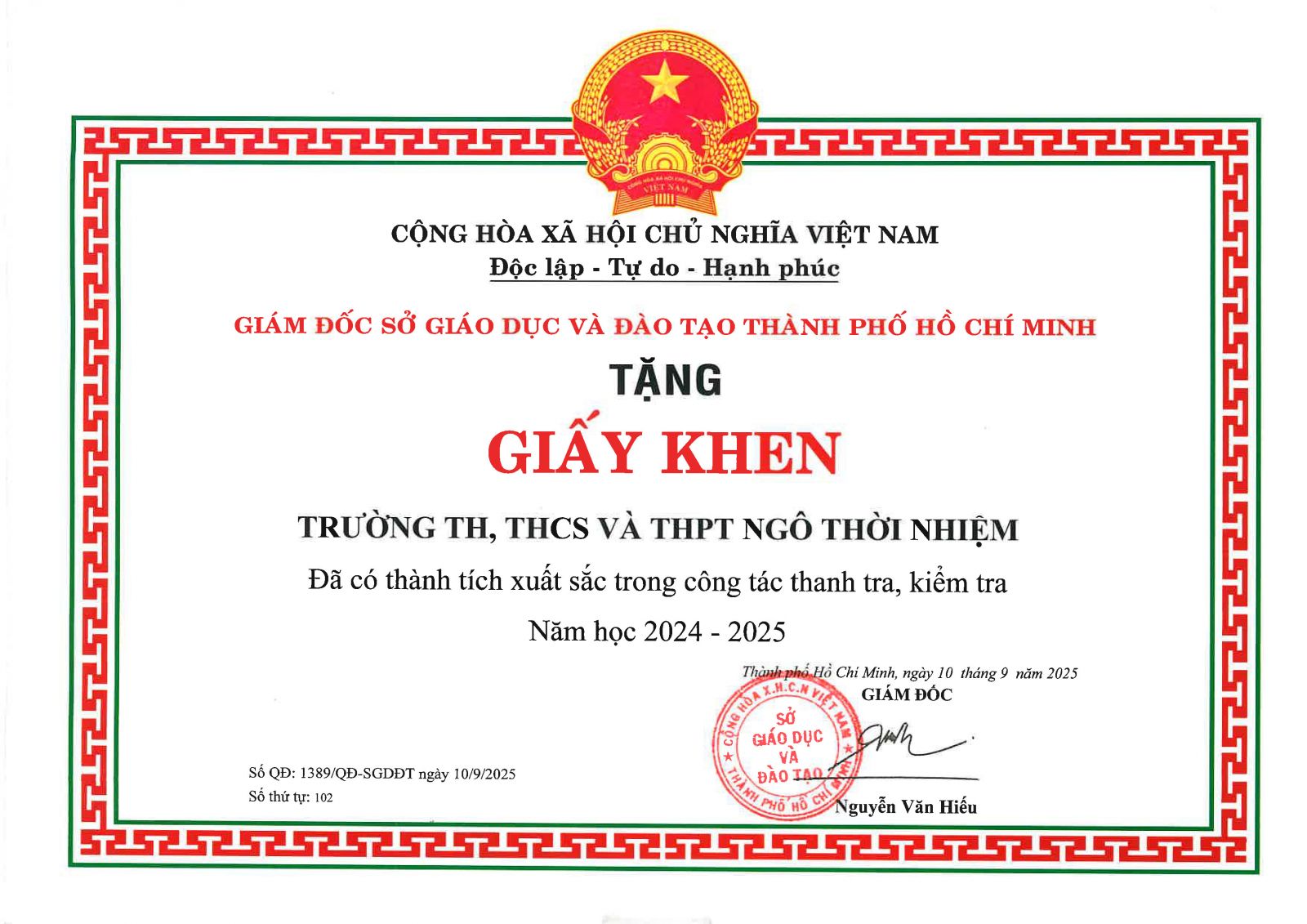 Ngày 16/9, tại Hội nghị Tổng kết công tác thanh tra, kiểm tra năm học 2024 – 2025 và Triển khai nhiệm vụ công tác kiểm tra, pháp chế năm học 2025 – 2026 do Sở Giáo dục & Đào tạo TP.HCM tổ chức, Trường TH, THCS và THPT Ngô Thời Nhiệm vinh dự nhiều giấy khen trong công tác thanh tra, kiểm tra và pháp chế.