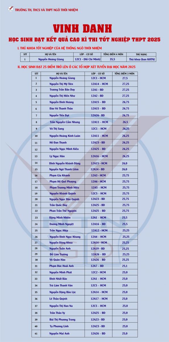 Kỳ thi tốt nghiệp THPT năm 2025 đã khép lại với nhiều thành tích ấn tượng, học sinh Trường THPT Ngô Thời Nhiệm đã đạt kết quả cao trong kỳ thi.